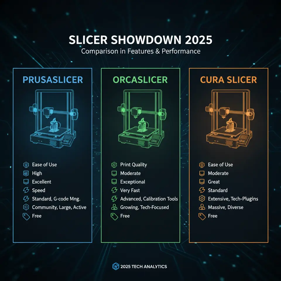 - Comprehensive comparison of PrusaSlicer, OrcaSlicer, and Cura Slicer
